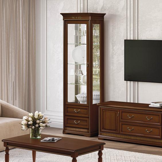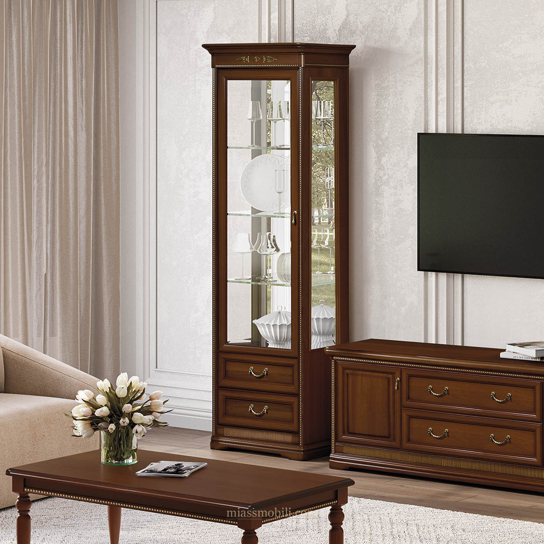 Фасад витрины декорирован накладными элементами. Высококачественная фурнитура обеспечивает долгий срок службы.